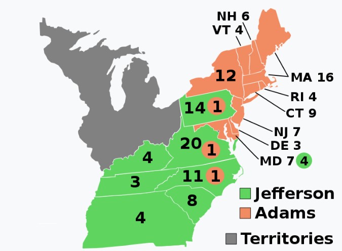 ELECTION DAY: In the first contested presidential election, Federalist (nationalist) Vice President John Adams is elected President with 71 Electoral votes. The runner-up, Republican (constitutionalist) Thomas Jefferson, becomes Vice President with 68 Electoral votes. Others receiving votes are: