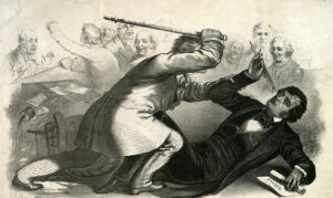 Postscript: Two days later Democratic Representative Preston S. Brooks (a nephew of Butler) assaulted Sumner with his cane, beating him so severely that he was unable to return to the Senate for three years.
