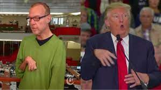 At a Republican (fascist/socialist) presidential campaign rally, in Myrtle Beach, south carolina, Donald J. Trump, owner of the Trump Group, mocks the physical disabilities of Serge F. Kovaleski, an investigative reporter for the New York Times.